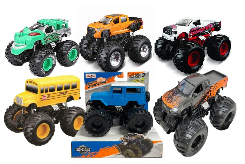 Maisto Earth Shockers with Display Stand - 6 Styles (24 Pack)Powerful Pull-Back motor with giant soft tires. Some models feature opening doors and working suspension.Bundle Includes: Dirt Demon x4 2022 Toyota Tundra TRD Pro x4 Ford F-150 XL x4 School Bus x4 1960 Toyota Land Cruiser (FJ40) x4 2017 Chevrolet Colorado XR2 x4